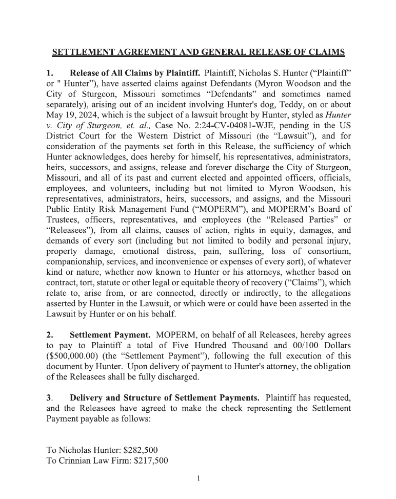 The settlement comes after a motion for summary judgement was filed in August 2025 with findings from the depositions. The deposition included Hunter, whose dog was killed. The defendants also provided depositions including Police Officer Myron Woodson who shot Teddy and the City of Sturgeon, which oversees local law enforcement including Sgt. Thomas Crawford who trained Woodson.