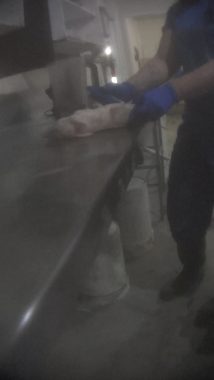 In the undercover footage captured by Animal Outlook, on multiple occasions, Holden Farms employees take deceased piglets, cut open their abdomens, and empty bodily fluids and their intestines into a blender. The blender’s contents are later mixed with feces from the mother pigs and water and fed to the mother pigs on camera.