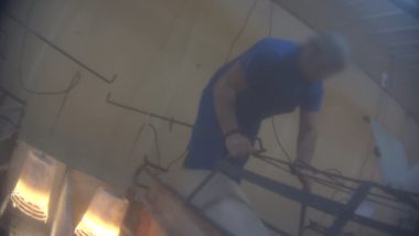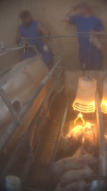 A worker castrates a piglet and prepares to throw the testicles at another worker