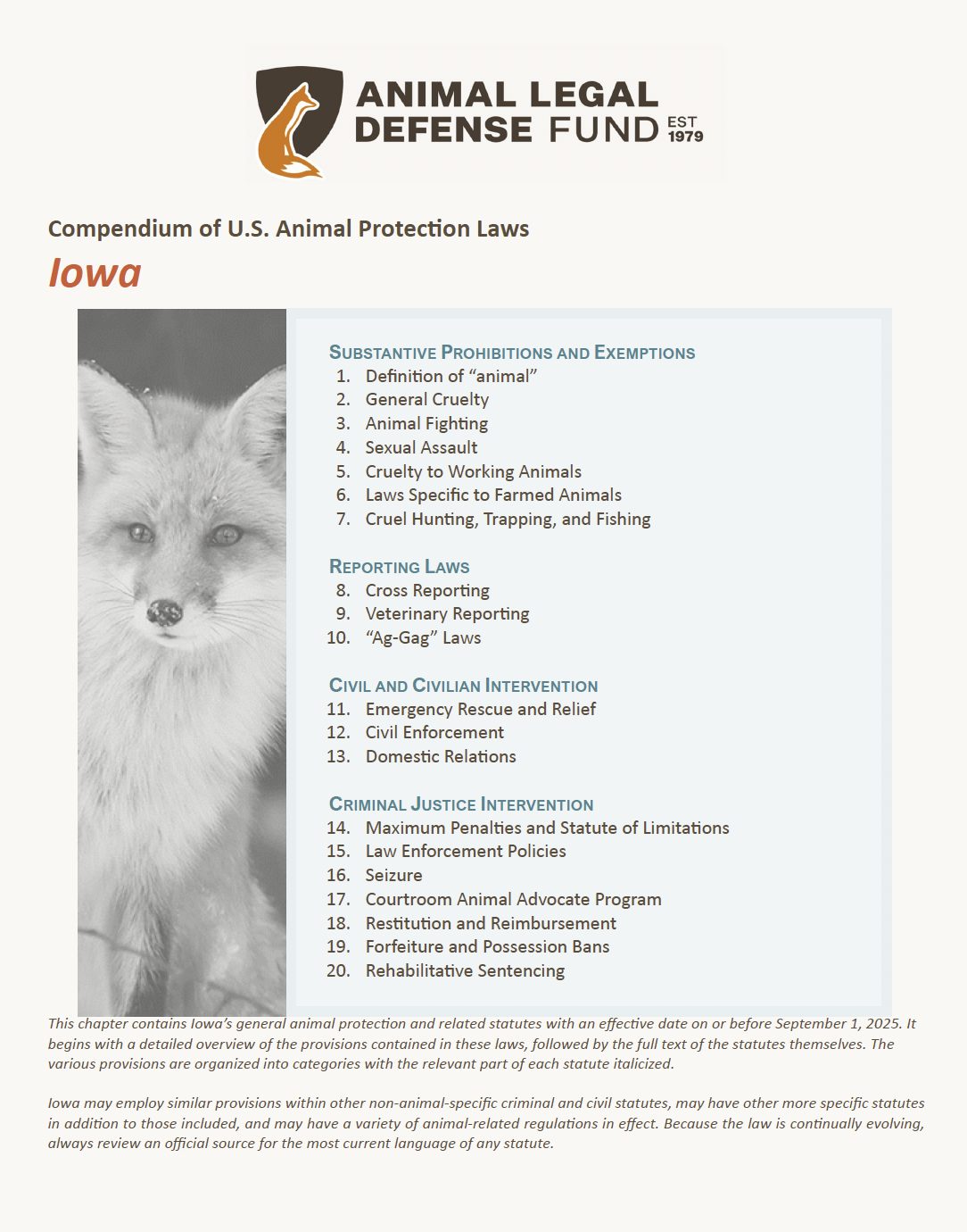 The Animal Protection Laws of Iowa compendium contains the general animal protection and related statutes for Iowa with an effective date on or before September 1, 2025.