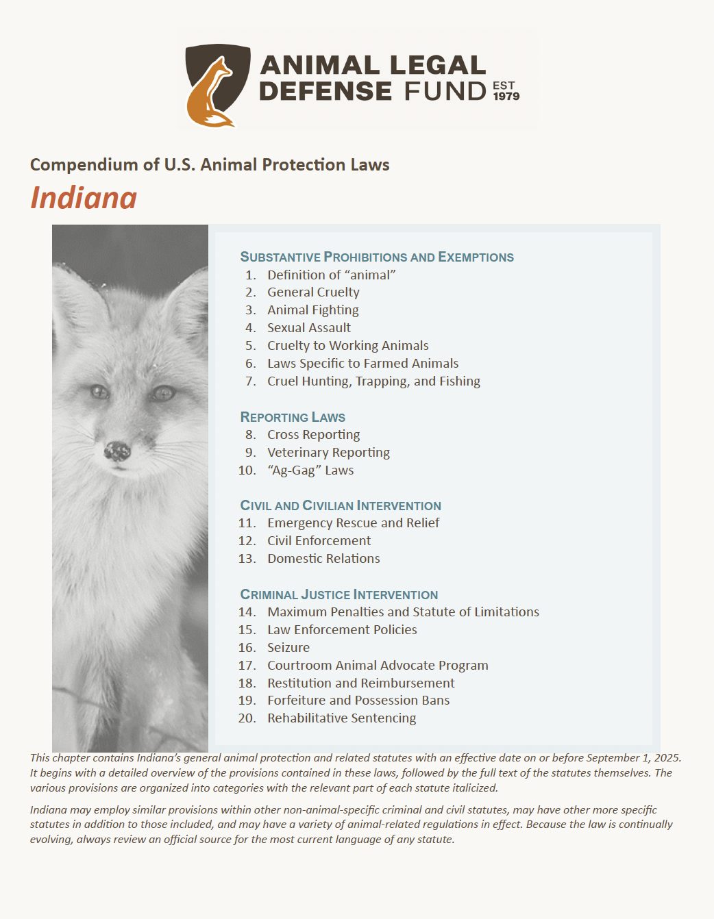The Animal Protection Laws of Indiana compendium contains the general animal protection and related statutes for Indiana with an effective date on or before September 1, 2025.