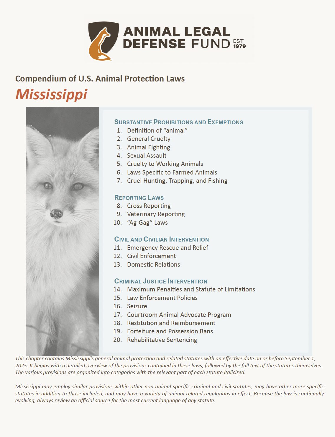 The Animal Protection Laws of Mississippi compendium contains the general animal protection and related statutes for Mississippi with an effective date on or before September 1, 2025.