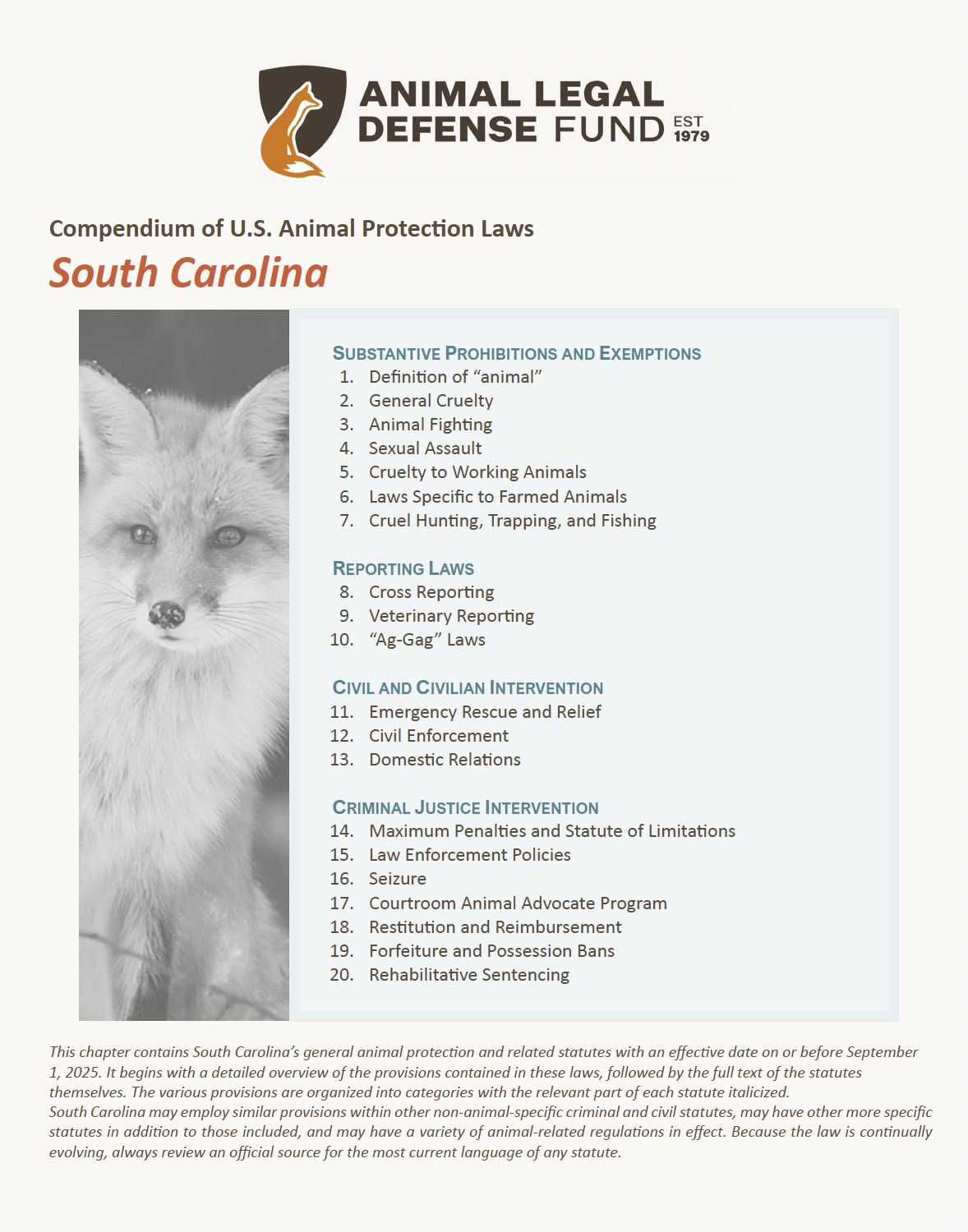 The Animal Protection Laws of South Carolina compendium contains the general animal protection and related statutes for South Carolina with an effective date on or before September 1, 2025.