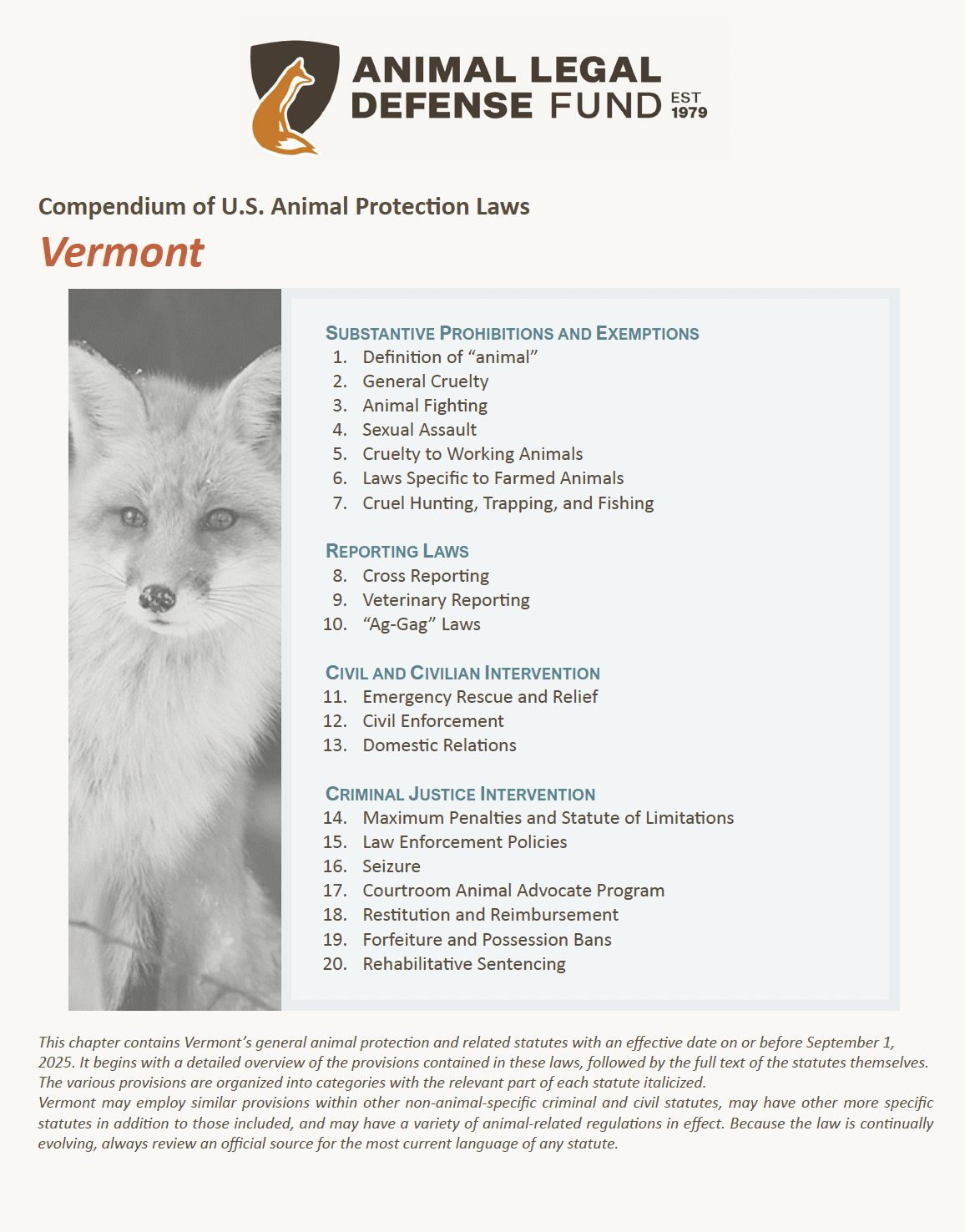 The Animal Protection Laws of Vermont compendium contains the general animal protection and related statutes for Vermont with an effective date on or before September 1, 2025.