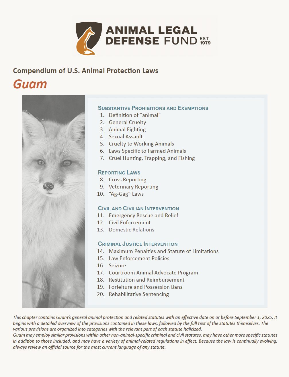 The Animal Protection Laws of Guam compendium contains the general animal protection and related statutes for Guam with an effective date on or before September 1, 2025.